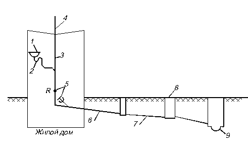 Рис. 3.1.1. Схема бытовой канализации: 1-приемники сточных вод (санитарные приборы); 2 – гидрозатворы; 3 – внутренняя канализационная сеть; 4 – вентиляционная часть; 5 – устройства для прочистки (ревизии и прочистки); 6-выпуски; 7-дворовая канализационная сеть; 8 – контрольный колодец; 9 – наружная сеть централизованной городской канализации. 3.2 Конструирование системы К1 Размещение элементов системы в строительных конструкциях здания и на территории произвожу с учетом возможности прокладки трубопроводов, размещения оборудования и труб, возможности их обслуживания, монтажа и демонтажа во время ремонта, с учетом расположения сопутствующих инженерных коммуникаций (отопления и вентиляции, электроснабжения), сохранения целостности несущих конструкций здания (балок, несущих перекрытий и стен, ригелей, колонн), а также минимальных затрат на материалы и монтаж. 3.2.1 Приемники сточных вод В качестве приемников сточных вод устанавливаю санитарные приборы, которые собирают загрязненные стоки образующиеся в результате хозяйственных и санитарно-гигиенических процедур. На кухне принимаю мойку для удаления загрязнений с продуктов и посуды. Принимаю мойку изготовленную из нержавеющей стали размером 600х600 мм, врезную, т.е. встраиваемую в отверстие в столешнице. В ванной комнате устанавливаем улучшенную ванну из полимерных материалов, размером 750х1700 мм. Для исключения затопления помещения ванну оборудую переливом, который соединяется с выпуском. В ванной комнате также размещаю умывальник с переливом размером 500х450 мм. В санузлах устанавливаем тарельчатый унитаз из керамики в комплекте со смывным бачком. 3.2.2 Гидрозатворы Гидрозатвор предназначен для предотвращения проникновения токсичных и опасных газов из канализационной сети в помещение, путем создания слоя воды величиной 60 мм. На мойке предусматриваю двухоборотный гидрозатвор, на ванной – двухоборотный с горизонтальным выпуском, на умывальнике – бутылочный, унитаз со встроенным гидрозатвором. Гидрозатворы изготовлены из полипропиленовой пластмассы, в виду ее повышенной термостойкости. 3.2.3 Канализационная сеть Канализационная сеть состоит: 1. отводные трубы от приемников сточных вод к стояку. 2. стояки, транспортирующие стоки в нижнюю часть здания 3. сборный коллектор, собирает воду от отдельных стояков и транспортирует ее за пределы здания. Канализационная сеть прокладывается так, чтобы кратчайшим путем в самотечном режиме удалить воду за пределы здания (см план этажа и подвала). Диаметр отводных труб принимаю конструктивно равным максимальному диаметру выпуска присоединенного к этому трубопроводу, диаметр стояка должен быть больше, либо равен максимальному диаметру отводного трубопровода присоединенного к нему, диаметр отводного коллектора больше либо равен максимальному диаметру присоединенного к нему стояка. Уклон отводных труб диаметром 50 мм принимаю не менее 0,03, при Ду=100 мм i³0,02, стояки прокладываю вертикально, допустимое отклонение от вертикали не более 10 мм на 1 м. Внутреннюю сеть монтирую из безнапорных полипропиленовых труб. Диаметр условного прохода (Ду) канализационных стояков принимаем 50 мм (для моек) и 100 мм (для санузлов). Канализационные стояки прокладываются вертикально. Присоединение боковых отводящих трубопроводов производим в косой тройник (под углом 4