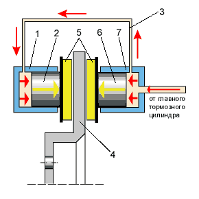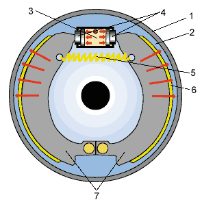 Рис. 4. Схема работы барабанного тормозного механизма: 1 - тормозной барабан; 2 - тормозной щит; 3 - рабочий тормозной цилиндр; 4 - поршни рабочего тормозного цилиндра; 5 - стяжная пружина; 6 - фрикционные накладки; 7 - тормозные колодки. Барабанный тормозной механизм (рис. 4) состоит из: - тормозного щита; - тормозного цилиндра; - двух тормозных колодок; - стяжных пружин; - тормозного барабана. Тормозной щит жестко крепится на балке заднего моста автомобиля, а на щите, в свою очередь, закреплен рабочий тормозной цилиндр. При нажатии на педаль тормоза поршни в цилиндре расходятся и начинают давить на верхние концы тормозных колодок. Колодки в форме полуколец прижимаются своими накладками к внутренней поверхности круглого тормозного барабана, который при движении автомобиля вращается вместе с закрепленным на нем колесом. Торможение колеса происходит за счет сил трения, возникающих между накладками колодок и барабаном. Когда же воздействие на педаль тормоза прекращается, стяжные пружины оттягивают колодки на исходные позиции.