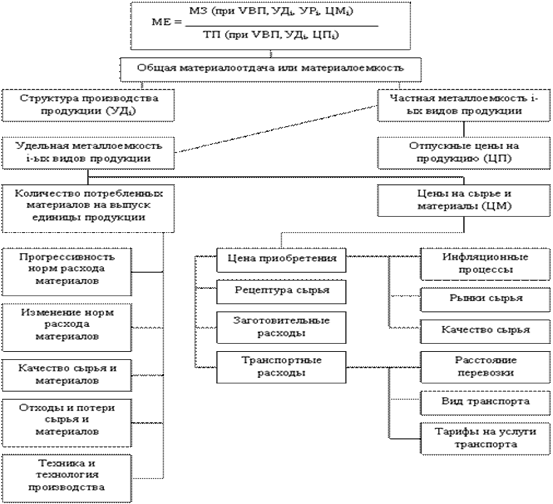 Рисунок 2 – Схема взаимосвязи факторов, определяющих общую материалоемкость в) по плановым нормам и плановым ценам на фактический выпуск продукции: МЗусл2 = ∑ (VВПфi * УРплi * ЦМплi); г) фактически по плановым ценам: МЗусл3 = ∑ (VВПфi * УРфi * ЦМплi); д) фактически: МЗф = ∑ (VВПфi * УРфi * ЦМфi). II. Стоимость товарной продукции: а) по плану: ТПпл = ∑ (VВПплi * ЦПплi); б) по плану, пересчитанному на фактический объем производства, при плановой структуре: ТПусл1 = ∑ (VВПфi * ЦПплi) ± ΔТПудi; в) фактически по плановым ценам: ТПусл2 = ∑ (VВПфi * ЦПплi); г) фактически: ТПф = ∑ (VВПфi * ЦПфi). На основании приведенных данных о материальных затратах и стоимости товарной продукции рассчитываются показатели материалоемкости продукции. Затем переходят к изучению материалоемкости отдельных видов продукции и причин изменения ее уровня. Она зависит от норм расхода материалов, их стоимости и отпускных цен на продукцию.