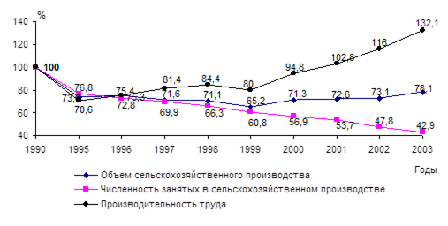 Рис. 6 - Изменение объемов строительных работ, численности занятых на этих работах и производительности труда (1990=100%) Количество объектов, находящихся в незавершенном строительстве, по данным переписи по состоянию на 1 июня 2003 г. и скорректированных на их ввод по октябрь текущего года, составило 14618. Сверхнормативную продолжительность строительства имеют 1843 объекта в промышленности, т.е. 85,7% от всего их количества по отрасли, а также 3419 объектов сельскохозяйственного назначения (94,6% от всех строек, предназначенных для развития сельского хозяйства). Рост среднемесячной заработной платы в сопоставимых ценах в строительстве составил в 2000 г. – 10%, в 2001 – 25,5%, в 2002 г. – 5,6%, в 2003 г. – 105,8% к соответствующему периоду прошлого года. В 2003 г. соотношение индексов реальной заработной платы и производительности труда составило 95,1% роста. Сельское хозяйство . В сельском хозяйстве, начиная с 1990 по 1995 г. наблюдалось падение производительности труда, при этом также снижалась численность занятых. С 1996 по 2003 г. производительность росла, за исключением 1999 г. За период с 1990 по 2003 г. численность работников в сельскохозяйственном производстве сократилась до 42,9%, а объем сельскохозяйственной продукции – на 22,1% (рис. 7). Среднемесячная заработная плата работников сельского хозяйства во второй половине 1990-х – начале 2000-х годов оставалась примерно в 2 раза ниже, чем в других отраслях реального сектора экономики (табл. 12). Транспорт. Создание наиболее выгодных экономических условий для транзитных перевозок через территорию республики, а также государственная поддержка наиболее важных международных, национальных и региональных транспортных программ позволили обеспечить сбалансированный рост перевозочной работы и повышение ее конкурентоспособности.