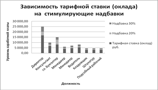 Это происходит из-за того, что на предприятии нет едино установленных сумм надбавок. Заработная плата сотрудника зависит от тарифной ставки и двух надбавок 20% и 30%. Зависимость тарифной ставки на стимулирующие надбавки представлены в диаграмме 2. Диаграмма 2