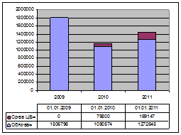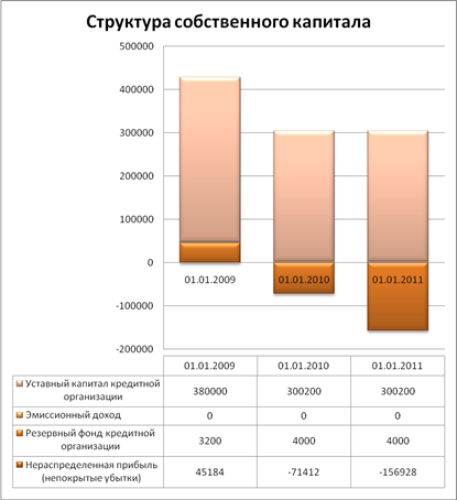 На рисунке 1 представлены изменения величины и структуры собственного капитала Форус Банка за три года. Видим, что структура капитала изменяется: нераспределенная прибыль превращается в непокрытые убытки, которые в свою очередь только растут. В 2009 году на 20% снижается уставный капитал, и на 25% вырастает резервный фонд. Банк старается покрывать возрастающие риски, но недостаточно. Банк еще даже не начал оправляться от кризиса, а наоборот, ситуация только ухудшается.