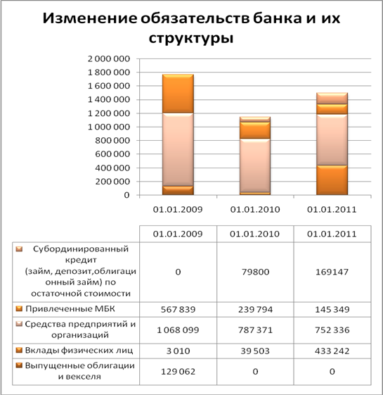 Рис. 2 Изменения обязательств банка и их структуры Рост обязательств в 2010 году объясняется, прежде всего, стабилизацией экономики и ростом активности на рынке. Форус Банк не может погасить и только продолжает накапливать кредит от ЦБ, который вырос почти в 2 раза. Банк прибегал к привлечению средств через выпуск векселей( 6% от пассива) в 2009 году, но к 2010 он их уже погасил. Большую долю в структуре обязательств занимают средства от некредитных организаций (примерно половину). Но хотя в сумме эти показатели всегда занимали большую часть, то теперь отчетливо видна динамика: почти не изменяются средства предприятий и организаций,но более,чем в 100 раз выросли вклады физических лиц,что говорит об общем экономическом росте экономики, и о возвращении доверия населения к банкам.
