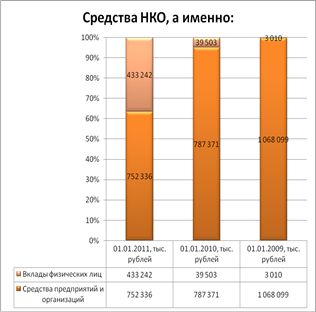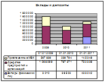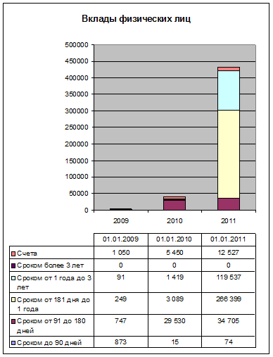 В целом можно отметить относительную стабильность доли средств предприятий и организаций в общих обязательствах, чего нельзя сказать об МБК. Это может объясняться тем, что в период кризиса банки старались держать дополнительный капитал на случай необходимости средств мгновенной ликвидности, сейчас же ситуация стабилизируется и они перенаправляют средства в более доходные проекты. Вклады от физических лиц Форус Банк принимает только с июня 2008 года, именно поэтому динамику этого показателя оценить сложно, так как пока он только растет: в 13 раз за 2009 год и в 11 раз за 2010. Но с другой стороны уже можно отметить, что население вполне доверяет банку и несмотря на кризис 2008 года деньги туда несет. Стоит при этом отметить, что у Форус Банка достаточно высокие проценты по вкладам, если сравнивать с другими банками. Вероятно, это и вызвало интерес у вкладчиков, а так же оказало влияние общее оздоровление экономики.