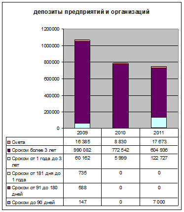 В кризисный год вкладчики предпочли краткосрочные депозиты, а в 2010 появилось большое количество более длительных, хотя по прежнему краткосрочных вкладов. А вот структура срочности средств юридических лиц относительно стабильна, не считая, что в кризисный 2009 год почти не стало депозитов от 1 до 3лет, остались только депозиты на срок свыше 3х лет. Изменению показателя средств на счетах придавать особого внимания не стоит, они слишком малы и их колебания вполне в пределах нормы (опять же: с учетом кризиса ликвидности в 2009 году).