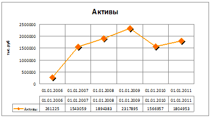 Рис. Динамика изменения привлеченных средств юр. лиц по срочности Активы банка Активы Форус Банка изменяются примерно так же как и пассивы: резкое снижение в течении 2009 года и динамика восстановления в 2010. Результаты 2010 года позволяют надеяться на то, что происходит восстановление экономики, т.к. темпы ее развития приближаются к докризисным. Более подробно показатели активов рассмотрим в разделе посвященном ключевым финансовым показателям. Ключевые финансовые показатели В следующей таблице рассмотрим финансовые показатели деятельности Форус Банка за 3 года. Многие значения нуждаются в пояснении. Итак, прежде всего, следует отметить, что после кризиса Форус Банк не может прийти в норму (вернуть докризисные показатели), а даже наоборот его положение стремительно ухудшается. Хотя основные нормативы и показатели (такие как Н1) банк старается поддерживать, но растущую убыточность и увеличивающийся кредит от ЦБ не скрыть. С 01.01.2010 банк работает в убыток. Именно поэтому такие коэффициенты как ROE, маржа прибыли, коэффициент роста и ROA меньше нуля.
