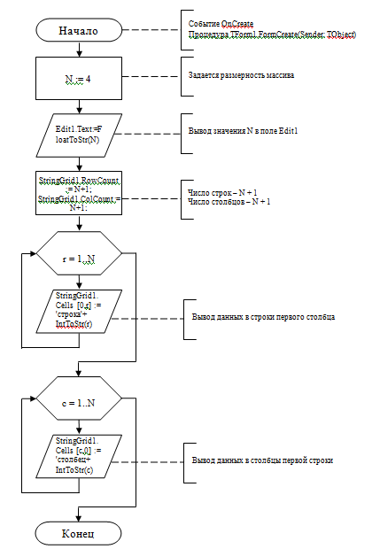 Рис. 1. Алгоритм работы программы при возникновении события OnCreate На рисунке 2 представлен алгоритм работы программы при нажатии на кнопку «Изменить размерность массива». Процедура TForm1.Button2Click(Sender: TObject).