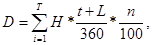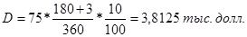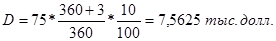 где в – величина дисконта, долл.; H – номинал векселя, долл.; t – срок векселя, т.е. число дней, оставшееся до наступления срока платежа по данному векселю; L – число льготных дней; n – учетная ставка, %; 360 – число дней в финансовом году. Тогда, для первого платежа: