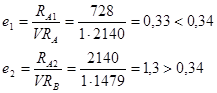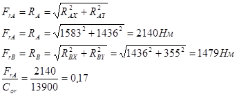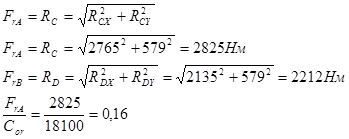 Принимаем коэффициенты по таблице 9.3 [1; с.133]) Х=0,56 - коэффициент радиальной нагрузки; Y=1,3 - коэффициент осевой нагрузки; е=0,33 - коэффициент осевого нагружения; V=1 – коэффициент вращения Определяем осевые составляющие радиальной нагрузки