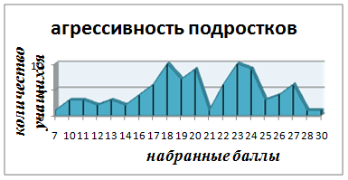 Рисунок 8. Чувство вины подростков Анализ результатов исследования (рис. 8) показал, что 24% испытывают сильное чувство вины, считают себя плохими, что негативно сказывается на их эмоциональном состоянии и способности к коммуникации. Учащиеся, которые так же составляют группу риска по этой категории, составляют 51%. Они склонны к заниженной самооценке и излишним угрызениям совести. Таким образом, можно сделать вывод, что в возрасте 13 – 15 лет на качество общения подростков наибольшее влияние оказывают такие компоненты как физическая агрессия, негативизм, вербальная агрессия и чувство вины, что впоследствии влияет на их дальнейшее развитие и поведение. 2.2.2 Изучение агрессивности и враждебности подростков Изучение агрессивности и враждебности подростков осуществлялось посредством обработки результатов исследования опросником Басса-Дарки. Коэффициент агрессивности составила сумма балов по шкалам «Физическая агрессия», «Раздражительность» и «Вербальная агрессия». Индекс враждебности включает в себя шкалы «Обида» и «Подозрительность». Результаты изучение агрессивности и враждебности подростков представлены в таблицах 13 – 14 (Приложение 2), и на рисунках 9, 10 в виде диаграмм. Нами изучалась агрессивность как свойство личности подростков, характеризующееся наличием деструктивных тенденций, в основном в области субъектно-объектных отношений.