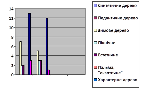 Аналіз дитячих малюнків за показником "типологія малюнків" свідчать, що більшість вихованців дітей з обмеженими психофізичними можливостями схильні до зображення так званого "змішаного типу" дерева. У цих малюнках присутні елементи різних дерев. На другому місці — тип "зимового дерева", елементи якого зустрічаються в змішаному типі найчастіше. Для цього типу дерев характерним є зображення голих гілок. Це свідчить про дитячу безпосередність, вміння бачити все немовби вперше, дивуватися світові. Це добрі ознаки здатності до творчості. Цей тип найчастіше зустрічається саме у дітей. Серед малюнків дітей виявилось два дерева, які можна віднести до "пікнічного типу"; два, які можна класифікувати як "естетичні". При зображенні дерев по "пікнічному типу" підкреслюється крона дерева. І так малюнки здійснюють люди з пікнічною конституцією чи ті, хто має розвинену інтуїцію. Для "естетичного типу" характерні володіння засобами зображення, розвинене почуття естетичної форми. Як правило цей тип властивий людям з художніми нахилами. Що стосується інших типів дерев з класифікації, наведеної вище, то ми бачимо, що в силу вікових особливостей, а можливо і внаслідок своєї психофізичної вади, серед цих малюнків ми не знаходимо дерев типу "ялинка", "пальма" тощо. Саме тип "ялинки" свідчить про організаторські нахили того, хто малює, про його активність. Таким чином, ми бачимо, що при роботі з дітьми з обмеженими можливостями нерозкритим ресурсом залишається у них розвиток естетичних нахилів, у тому числі за рахунок занять з малювання. Наступна частина нашої роботи по інтерпретації тесту "дерево" проводилась з урахуванням рекомендацій щодо аналізу графічного матеріалу, розроблених Р. Стором [87, С.78]. він виділив такі фігури. Які мають значення при психологічній діагностиці. Всі ці фігури згруповані в 15 категорій. За рекомендаціями Р. Стора ми взяли до уваги різні зображення на малюнку та їх характер: ґрунт, стовбур, коріння, симетрія, хрести, розташування на сторінці, форма листя, штриховка та інші показники. С. Романова і О. Потьомкіна також говорять про психологічне значення фігур [87], якими ми скористались у цьому дослідженні. Систематизувавши все це, ми отримали дані, які наводимо в таблиці 1. Ми використали метод рандомізації (ранг) — процедура, яка гарантує рівні можливості кожному члену популяції стати учасником експерименту. Кожному представнику вибірки призначається порядковий номер, а вибір піддослідних у експериментальну і контрольну групи проводиться за допомогою таблиці "випадкових" чисел. Рандомізація є способом, що дозволяє виключити вплив індивідуальних особливостей піддослідних на результат експерименту. На думку Кемпбелла рандомізація є 98 універсальним способом урівняння груп перед експериментальною взаємодією. Інші способи, наприклад, метод попарного порівняння характеризується як ненадійні, що ведуть до невалідних висновків. Ми отримали наступні дані. За їх свідченнями психологічні проблеми, діагностовано в даних групах дітей, різноманітні. Отримані дані мають орієнтовний характер. Вони дають більшу можливість для якісного аналізу того, що скоріше на рівні підсвідомості хвилює дітей обмеженими психофізичними можливостями даних груп. Таблиця 1 ІНТЕРПРЕТАЦІЙНІ ДАНІ ЗА ТЕСТОМ "ДЕРЕВО"