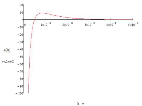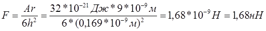 где А – константа Гамакера для данной системы (константа дисперсионного взаимодействия молекул фаз), r – радиус частицы, h – расстояние между поверхностью сферической частицы и плоской поверхностью. Имеем:
