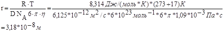 где NА – число Авогадро, 6 · 10 23 молекул/моль; h – вязкость дисперсионной среды, Н · с/м2 (Па · с); r – радиус частицы, м; R – универсальная газовая постоянная, 8,314 Дж/моль · К; T – абсолютная температура, К. Имеем: