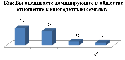 Почти половина респондентов (45,6%) уверена в том, что в обществе доминирует положительное отношение к многодетным семьям, что в целом должно являться основанием для реализации эффективной политики поддержки данной категории семей. 37,5% респондентов считают, что в обществе доминирует нейтральное отношение к многодетным семьям и только 9,8% опрошенных считает, что данное отношение является отрицательным. Диаграмма № 4