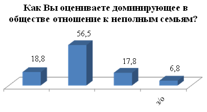 Большинство (56,5%) из тех, кто ответил на вопросы анкеты, считает, что к неполным семьям в обществе преобладает нейтральное отношение. Возможно, данное обстоятельство связано с тем, что неполных семей в личном окружении москвича больше, чем других семей перечисленных категорий. Также подчеркнём, что примерно равные группы москвичей (около 18%), говорят о том, что к неполным семьям в обществе преобладает положительное либо отрицательное отношение. Диаграмма № 5