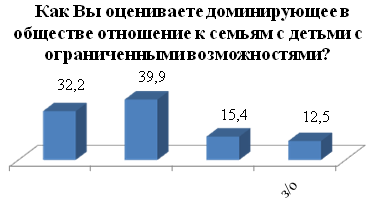 К семьям с детьми с ограниченными возможностями в целом наблюдается нейтральное (39,9%) либо положительное (32,2%) отношение в обществе. 15,4% респондентов считают, что преобладает отрицательное отношение к данной категории семей. Обращает на себя внимание тот факт, что 12,5% респондентов затруднились при ответе на поставленный вопрос, что значительно больше, по сравнению с результатами оценки предыдущих категорий семей. В целом подчеркнём, что ни один из вариантов ответа не получил решающего преимущества по сравнению с другими. Этот факт может свидетельствовать о том, что в обществе ещё не сформировалось доминирующее отношение к семьям с детьми с ограниченными возможностями. Диаграмма № 6