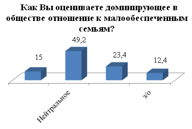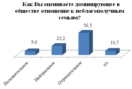 При ответе на вопрос об отношении к неблагополучным семьям респонденты проявили максимальное единомыслие, так как 56,5% москвичей считают, что в обществе господствует отрицательное отношение к этой категории семей и только 9,6% граждан полагает, что данное отношение можно оценить термином «положительное». Примерно такая же группа респондентов затруднилась при ответе на данный вопрос. Стоит подчеркнуть, что в целом в обществе наиболее негативное отношение вызывают неблагополучные семьи и данное мнение подтверждают полученные результаты опроса. Ни одна группа социально незащищённых семей, рассматриваемых в данном исследовании, не вызывает в обществе подобного отрицательного отношения. Диаграмма № 8
