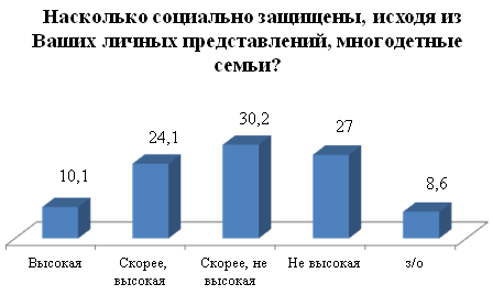 Мнения респондентов при ответе на поставленный вопрос разделились примерно поровну между вариантами «скорее, высокая» - 24,1%; «скорее, не высокая» - 30,2; «не высокая» - 27%. Только каждый десятый респондент считает, что многодетные семьи имеют высокую степень социальной защищённости. Диаграмма № 10