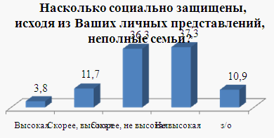 Большая часть москвичей, принявших участие в опросе, считает, что неполные семьи имеют слабую социальную защищённость. Варианты ответа «скорее, не высокая» и «не высокая» в сумме выбрали 73,6% респондентов. При этом крайне мал процент тех, кто считает, что неполные семьи имеют высокую степень социальной защищённости (3,8%). Затруднившихся с ответом на поставленный вопрос в итоге оказалось 10,9%, что является достаточно высоким показателем. Диаграмма № 11