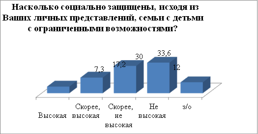 Как и в предыдущем вопросе, общественное мнение склоняется к той точке зрения, что семьи с детьми с ограниченными возможностями имеют не высокий уровень социальной защищённости. В сумме 63,6% выбрали варианты ответа («скорее, не высокая», «не высокая»), что свидетельствует о необходимости усиления поддержки семей данной группы и увеличении информационного освещения данной темы со стороны органов власти и управления. Диаграмма № 12