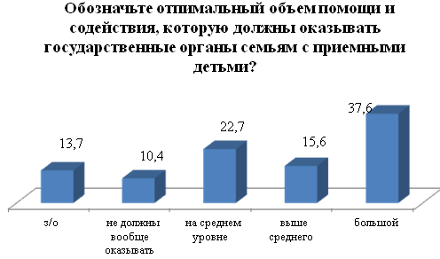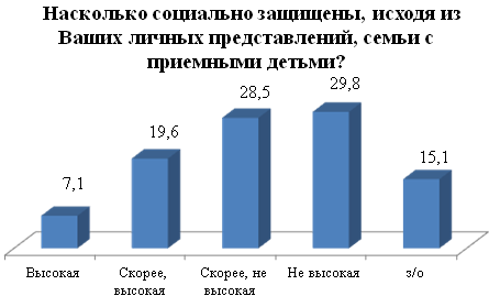 При оценке социальной защищённости семей с приёмными детьми выявился несколько меньший процент (по сравнению с предыдущими вопросами) респондентов, считающих его уровень не высоким. Суммарный показатель ответов («скорее, не высокая», «не высокая») в данном случае составляет 58,3%. Обращает на себя внимание тот факт, что 19,6% респондентов представляется, что, скорее, этот уровень является высоким. На наш взгляд, это связано с тем, что возможность усыновить ребенка воспринимается как привилегия обеспеченных семей, у которых есть возможность найти дополнительные деньги на его содержание. Диаграмма № 13