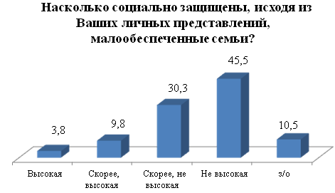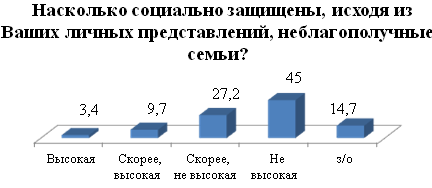Очень большая группа респондентов полагает, что неблагополучные семьи в столице социально не защищены. 45% выбрали вариант ответа «не высокая» степень защищённости. 27,2% респондентов говорят о том, что степень защищённости «скорее, не высокая». Только около 13% от всей выборочной совокупности выбрали ответы о «высокой» либо «скорее, высокой» степени защищённости. Диаграмма № 14