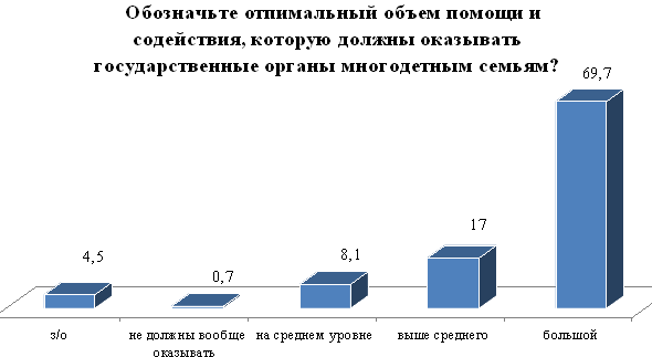 Государственные органы власти должны оказывать большой объём помощи многодетным семьям. Так считает 69,7% респондентов. Ещё 17% опрошенных выбрали вариант ответа «выше среднего». Говорящим сам за себя является тот факт, что мнение о том, что государство не должно вообще оказывать помощь и содействие многодетным семьям разделяет лишь 0,7% москвичей, принявших участие в мониторинге. Затруднилось с ответом не большое число респондентов – 4,5%. Диаграмма № 23