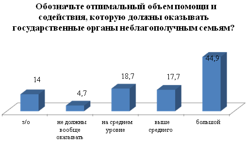 На представленной диаграмме отчётливо видно, что с точки зрения большинства респондентов многодетные семьи достаточно сильно нуждаются во всех перечисленных видах помощи и поддержки. Например, более 60% полагают, что данной группе остро необходима финансовая помощь, а также льготные медицинские и образовательные услуги. Ещё около 30% отмечают высокий уровень необходимости оказания всех перечисленных видов помощи данным семьям. Также высокую актуальность, по мнению респондентов, имеет оказание натуральной помощи (вещами, продуктами) многодетным семьям. В то же время чуть меньшая потребность имеется в психологической помощи. 26,3% респондентов считают, что многодетные семьи в данной поддержке нуждаются незначительно. Также чуть менее актуальной, хотя также востребованной, представляется информационная поддержка. сирота семья неблагополучный Диаграмма № 17