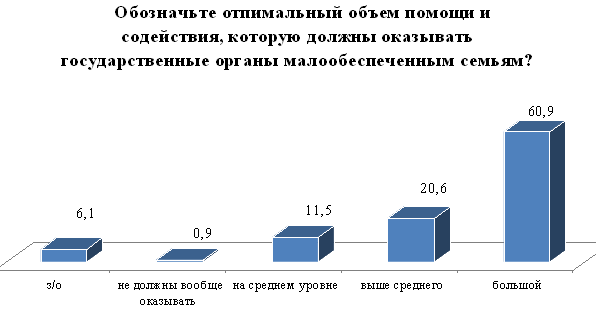 Подавляющее большинство населения считает, что органы государственной власти должны оказывать большой объём помощи малообеспеченным семьям. Так считает 60,9% респондентов. Ещё 20,6% москвичей придерживаются мнения, что объём помощи должен быть выше среднего. Менее одного процента респондентов говорят об отсутствии актуальности поддержки семей данной группы со стороны органов власти. В целом необходимо отметить, что к малообеспеченным семьям в обществе присутствует значительное сочувствие и понимание того, что данной группе необходима помощь и поддержка. Диаграмма № 28