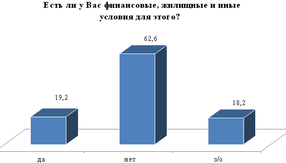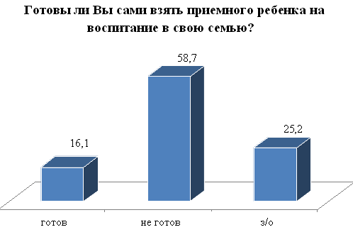 Диаграмма свидетельствует, что больше половины респондентов (58,7%) не готовы взять приёмного ребёнка в свою семью. Заявили о своей готовности сделать этот шаг только 16,1% участников опроса, что в целом является достаточно высоким показателем. Обращает на себя внимание тот факт, что почти каждый четвёртый респондент затруднился при ответе на поставленный вопрос. Это свидетельствует о том, что группа лиц, потенциально готовых взять в свою семью приёмного ребёнка на воспитание, может увеличиться. Для многих респондентов данный вопрос является сугубо личным, поэтому они склонны уклоняться от ответа. Диаграмма № 34