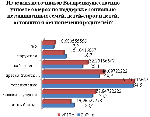 В диаграмме приведён сравнительный анализ результатов ответов респондентов на вопрос об источниках получения информации о мерах по поддержке социально незащищённых семей, детей-сирот и детей, оставшихся без попечения родителей в 2009 и 2010 годах. Стоит подчеркнуть, что результаты за год изменились не сильно. По-прежнему основным источником получения информации является телевидение (65% выбрали именно этот источник). В 2010 г. несколько более популярным источником информации о мерах по поддержке социально незащищённых семей стала пресса (газеты, журналы) и рассказы других людей (по сравнению с 2009 г. данные показатели увеличились на 3,8 и 2,3% соответственно). Сайты сети Интернет также стали более популярным источником информации по рассматриваемой теме. Данный источник информации стал более востребованным на 3,9% и этот показатель является самым существенным изменением по сравнению с 2009 годом. Чуть менее актуальным стали личный опыт (только 20% сталкивались с этой темой в 2010 г.), а также наружная информация. Диаграмма № 36