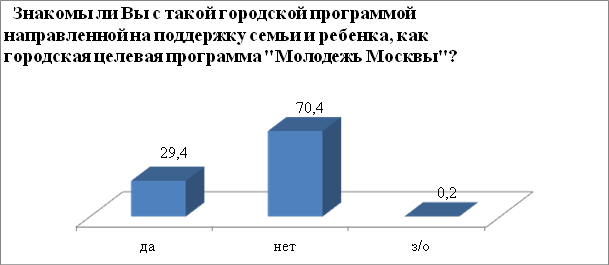 Почти каждый третий москвич (29,4%) знает о такой программе, как «Молодёжь Москвы». Данный результат следует признать хорошим, что свидетельствует о реальной востребованности реализуемой программы. Диаграмма № 37
