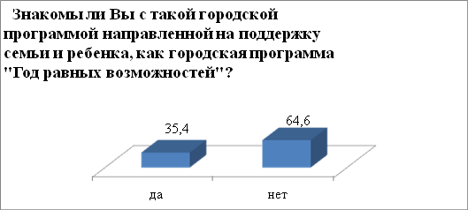 Городская программа «Год равных возможностей», направленная на поддержку инвалидов, является более известной по сравнению с программой «Молодёжь Москвы». О программе «Год равных возможностей» информированы 35,4% москвичей, принимавших участие в исследовании. Данный результат также следует признать хорошим, особенно учитывая тот факт, что программа ориентирована на определённый сегмент общества. Диаграмма № 38