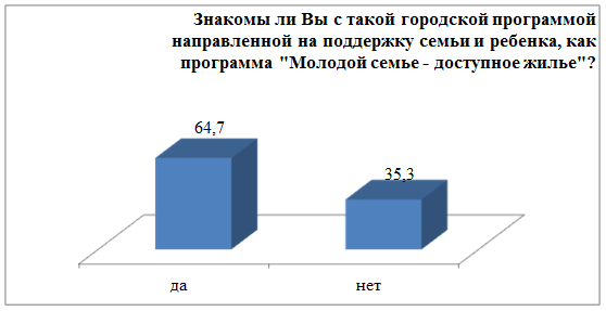 Городская программа «Молодой семье – доступное жильё» является наиболее известной среди всех остальных. Большинство респондентов (64,7%) знают о её существовании. Данное обстоятельство свидетельствует об эффективности мероприятий, реализуемых в рамках данной программы, даже не смотря на то, что она ориентирована на молодёжь. Следует подчеркнуть, что хорошая известность данной программы положительно влияет на имидж Правительства Москвы в целом. Диаграмма № 39