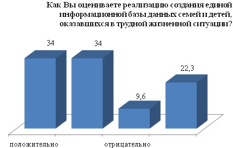 Преобладающая часть респондентов положительно оценивает создание единой информационной базы данных семей и детей, оказавшихся в трудной жизненной ситуации. В сумме 68% участников опроса положительно либо удовлетворительно относится к созданию данной системы. Отрицательно к данному институту относится примерно один из десяти респондентов (9,6%). Диаграмма № 56