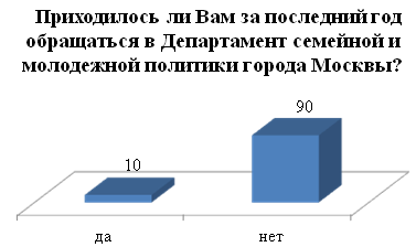 Согласно результатам исследования, каждый десятый респондент за последний год обращался в Департамент семейной и молодёжной политики города Москвы. Полученные результаты свидетельствуют о высокой актуальности работы Департамента и его значения для жителей столицы. Диаграмма № 64