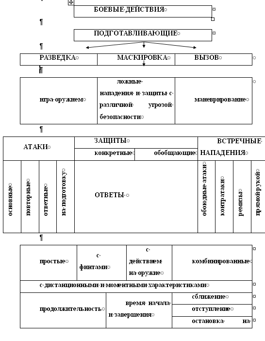 Основы фехтования СОДЕРЖАНИЕ 1. основы фехтования 1.1 история развития фехтования 1.2 классификация технических приемов и боевых действий, терминология фехтования 1.3 характеристика фехтования на рапирах 1.4 характеристика фехтования на шпагах 1.5 характеристика фехтования на саблях 1. ОСНОВЫ ФЕХТОВАНИЯ 1.1 ИСТОРИЯ РАЗВИТИЯ ФЕХТОВАНИЯ Фехтование в древнем мире. Борьба первобытного человека за существование, а позднее беспрерывные захватнические и оборонительные войны, которыми полна история народов древнего мира, были причинами возникновения и усовершенствования холодного оружия. Одновременно росло мастерство владения им. В древности обучение воинов начиналось с раннего детства, что можно установить на основе анализа исторических памятников, бытовых и религиозных обрядов, данных по истории физической культуры, произведений изобразительного искусства. У народов Древней Индии существовала святая книга, содержащая принципы упражнений с оружием. В качестве преподавателей выступали члены секты браминов. Они давали свои уроки на городских площадях. В дальнейшем обучением искусству фехтования стали заниматься профессиональные воины. В Древнем Египте распространенным видом упражнения с оружием было фехтование на палках со специальной рукояткой, предохраняющей вооруженную руку. Тонкая дощечка, закрепленная на предплечье свободной руки тремя ремнями, представляла собой щит для отражения ударов противника. В Древней Греции в почете были физические упражнения и военные игры. В качестве оружия греки пользовались подобием шпаги, которая являлась как колющим, так и рубящим оружием. Греки создали школы обучения владению холодным оружием. Основным средством защиты был щит. Чтобы избежать укола или удара использовались уклонения туловищем, а также перемещения назад и в стороны. В Римской империи широко практиковалось изучение владения холодным оружием. Довольно значительное количество преподавателей, которых называли «докторами оружия», обучали солдат в римской армии. «Доктора оружия» в Риме были очень известными людьми и нередко награждались высокими знаками отличия. Фехтование как зрелищное искусство владения холодным оружием получило широкое распространение в древнем мире. В период разложения Римской империи кровавые поединки были излюбленным зрелищным развлечением народа. В Риме первые поединки гладиаторов проводились в 264 г. до н. э. на празднествах. Гладиаторы набирались из рабов, которых обучали искусству владения холодным оружием. Начинающие гладиаторы упражнялись вначале деревянными шестами и палками. Они наносили удары по столбу, врытому в землю, или по чучелу, набитому соломой. При этом изучались положения и позы, строго соблюдаемые при публичных выступлениях. Фехтование в средние века. В средние века искусство владения холодным оружием носило ярко выраженный классовый характер - им занимались преимущественно представители аристократии феодальных княжеств и государств. Фехтование было жизненно необходимым навыком, помогавшим не только преуспеть в жизни, но и уцелеть в ходе рыцарских турниров и дуэлей. Но было бы ошибочным утверждать, что простые горожане и крестьяне в этот период не занимались фехтованием. Среди них было широко развито фехтование на палках, обитых железом, и на алебардах (род секиры