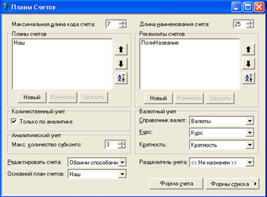 Рис.14 1. Максимальная длина кода счета. Зададим 7; 2. Длина наименования счета 25; 3. Планы счетов. Нажимаем [Новый]. Появилось сообщение "Для бухгалтерии был добавлен Документ операций". [ОК]. Мы вошли в окошко свойств плана счетов; 4. Идентификатор – Наш. Шаблон кода - ###.### 5. Добавим реквизит "ПолноеНазвание" типа Строка неограниченной длины; 6. Количественный учет только по аналитике – Да. Аналитический учет – максимальное количество субконто– 3; 7. Редактировать счета – Обоими способами; 8. Основной план счетов – Наш; 9. Валютный учет. Справочник валют – С.Валюты; 10. Курс – Курс; 11. Кратность – Кратность; 12. Разделитель учета- не назначен; 13. Создадим форму счета.