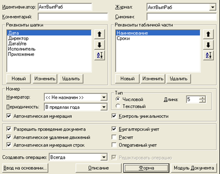Рис.21 Напишем в модуле формы процедуру: Процедура ПриОткрытии() ИспользоватьВалюту(Константа.ОснВалюта); // Здесь мы указываем, что в форме операции по умолчанию использовать основную // валюту КонецПроцедуры Создадим и форму списка операций, самого простого вида. 2.4 Создание документов и журналовДокумент Приходная Накладная. Составляется при оприходовании на склад ТМЦ. В дереве метаданных выбираем раздел "Документы". Создаем новый документ. Идентификатор: ПриходнаяНакладная Журнал: ПриходныеНакладные Нумератор: Нет Периодичность: Год Длина: 5 Тип: число Уникальность: да Автонумерация: да Может являться основанием для документа любого вида?: нет