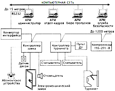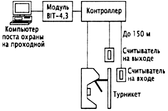 Рис. 11. Структурная схема СКУД «Центр» Перед выдачей электронного ключа его код и данные о его будущем владельце заносятся в базу данных системы. Для занесения кода «ключа» оператору достаточно коснуться им контрольного считывателя, установленного на рабочем месте рядом с компьютером. Необходимые текстовые данные (Ф. И. О., должность, подразделение, паспортные данные и т. д.) вводятся в поля с помощью клавиатуры компьютера. В специальное окно «карточки» заносится изображение владельца электронного ключа. В процессе задания ограничений доступа можно указать начальную и конечную дату периода действия «ключа», а также доступные пункты прохода (турникеты) и интервалы времени по дням недели, в течение которых можно пройти через турникеты с помощью данного электронного ключа. Полная процедура регистрации занимает не более 23 мин. При выходе посетителя в момент считывания кода система автоматически переводит выданный ему «ключ» в разряд свободных, а компьютер поста охраны на проходной выдает речевое сообщение типа: «Внимание! Гость организации, просьба забрать ключ!» После возвращения гостевого ключа в бюро пропусков он вновь может быть выдан очередному посетителю, а вся информация об ушедшем госте сохраняется в базе данных. У входа на предприятие на панели турникета или рядом с ним устанавливаются считыватели, которые считывают с карточек их код и передающие эту информацию в контроллер системы. В системе каждому коду поставлена в соответствие информация о правах доступа владельца карточки. На основе сопоставления этой информации и ситуации, при которой была предъявлена карточка, система принимает решение: контроллер открывает или блокирует проход через турникет. Подобным образом регулируется и выход с предприятия. Информацию об этих событиях в любой момент можно просмотреть на экране компьютера. В системе также осуществляется контроль доступа во внутренние помещения предприятия. Причем в особо важных помещениях (например, бухгалтерия, склад или др.) считыватели устанавливаются на входе и выходе. На основе сопоставления информации о правах доступа и ситуации, при которой был предъявлен «ключ», система принимает решение: контроллер открывает или блокирует проход через двери, переводит помещение в режим охраны, включает сигнал тревоги и т. д. Все факты предъявления «ключей» и связанные с ними действия (проходы, факты срабатывания датчика и нажатия кнопки турникета и т. д.) фиксируются в контроллере, автоматически заносятся в журнал событий, связанных с проходом через турникет проходной и сохраняются в компьютере. Причем для каждого события указывается: его характер, дата, время, код предъявляемого «ключа» и Ф. И. О. его владельца или дежурного оператора, нажавшего кнопку. Программное обеспечение системы позволяет вести учет рабочего времени сотрудников и посетителей, которым выданы «ключи», получать разнообразные отчеты о событиях в системе за выбранные промежутки времени. Если в течение рабочего дня какому-либо сотруднику необходимо неоднократно входить и выходить через проходную, то при формировании отчетов о рабочем времени система суммирует отдельные промежутки времени его пребывания на территории организации. Важной особенностью системы является то, что любой владелец ключа, проникший в здание, минуя прохо