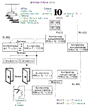 Рис. 14 Структурная схема СКУД «PERCoSбОО» АРМ автоматизированное рабочее место ПО работает под управлением Windows 98 SE, Windows NT или Windows 2000 и имеет удобный русскоязычный интерфейс, напоминающий большинство современных Windowsприложений. В зависимости от решаемых задач можно использовать две версии ПО: базовое и с разграничением доступа по времени. Система PERCoS600 обеспечивает эффективное решение следующих задач: контроль и управление доступом, контроль трудовой дисциплины и учет рабочего времени; защита материальных ценностей и информации; комфортные условия работы руководителя; автоматизированный кадровый учет, оформление и выдача пропусков; оперативное управление оборудованием. 7. СКУД PERCoSYSTEM12000 гибкая система контроля и управления доступом, которая дает возможность комплексно решать такие проблемы, как контроль доступа и перемещения персонала и посетителей, охрана территории, кадровый учет, трудовая дисциплина и учет рабочего времени. Система может применяться разных объектах: в банках, офисах, на промышленных предприятиях, в административных учреждениях, на военных и стратегических объектах, на автостоянках, атомных и гидроэлектростанциях, на вокзалах, в аэропортах. Структурная схема СКУД «PERCoSYSTEM12000» приведена на рис. 15. PERCoSYSTEM12000 представляет собой сеть контроллеров PERCoSC12100, PERCoSC12100P, PERCoCL12200 и концентраторов PERCoSC12200 (до 255). Каждый контроллер в системе обслуживает одно или два исполнительных устройства и один или два считывателя карт доступа. Для идентификации пользователей в системе используются бесконтактные или магнитные пластиковые карты доступа.