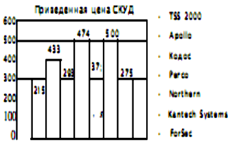 Рис. 27. Стоимость основного оборудования и программного обеспечения СКУД различных фирм в расчете на один пункт прохода (дверь) Таблица 4. Стоимость СКУД различных фирм в расчете на один пункт прохода