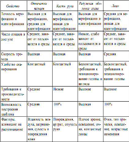 Путем простого сравнения определяем, что при прочих равных условиях приведенная стоимость СКУД минимальна у системы TSS2000 фирмы «Семь Печатей TSS». 4.4 Выбор биометрических СКУД Методы биометрической идентификаций различны; каждый их них имеет свои достоинства и недостатки и востребован в своей области применения. Тем не менее, после анализа различных устройств можно суммировать основные преимущества и недостатки наиболее популярных типов биометрических идентификаторов. Результат этого анализа представлен в табл. 5. Таблица 5. Преимущества и недостатки биометрических идентификаторов