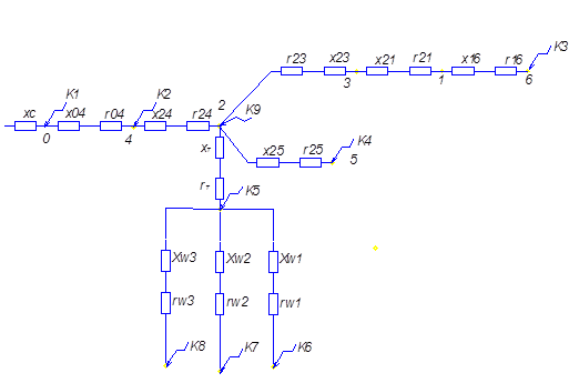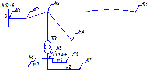 Рисунок 7.1- Схема расчета токов КЗ Количество точек КЗ на стороне высокого и низкого напряжений одинаково, однако число сопротивлений на стороне 10 кВ больше, чем на стороне 0,38 кВ, поэтому принимаем Uб =10,5 кВ.