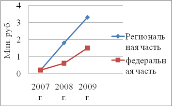 Анализируя динамику видно, что сумма налога на прибыль исчисленная в 2009г., по сравнению с 2008г., увеличилась на 2157447 руб. Это связано с ростом налоговой базы в 2009г., (на 8989365руб.) и соответственно ростом доходов предприятия. Посмотрим также диаграмму для сравнения перечислений налога на прибыль ОАО «Курская фабрика технических тканей» за 2007-2009 гг. в бюджеты разных уровней (рис. 2)
