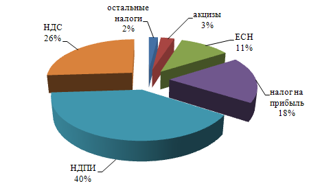 Рисунок 2.1 – Структура поступлений администрируемых ФНС России доходов в федеральный бюджет по видам налогов за 2008 год, % 2.2 Динамика налоговых доходов Если анализировать доходы нашей бюджетной системы с точки зрения реального наполнения ее финансовыми ресурсами, то становится очевидным, что основным источником формирования доходного потенциала являются налоговые поступления. Обратимся к федеральному уровню бюджетной системы РФ. Динамика налоговых поступлений за период с января по ноябрь 2007 года и 2008 года. (млрд. рублей). Налог на прибыль вырос с 641,3 на 708,0 млрд. руб. ЕСН увеличился с 405,0 до 448,7 млрд. руб. НДС снизился с 1424,7 до 1024,2 млрд. руб. Акцизы по сводной группе увеличились с 108,8 до 114,5 млрд. руб. НДПИ поднялся с 1122,9 до 1532,0 млрд. руб. Значительная часть налоговых поступлений в 2008 году была обеспечена за счет налога на добавленную стоимость, НДПИ, налога на прибыль организаций, ЕСН и акцизов. Доходы федерального бюджета на 2008 год утверждены на уровне 6 644,0 млрд. рублей, исходя из прогнозируемого объема валового внутреннего продукта в сумме 35000,0 млрд. рублейи уровня инфляции 7%[5] . Анализ показывает, что налоговые доходы занимают лидирующее место в доходах федерального бюджета, их доля к 2008 году составила более 85,4%. Такой рост объясняется снижением налоговой нагрузки на экономику, а также ожиданиями менее благоприятной внешнеэкономической коньюктуры. В отличие от 2007 года основную долю налоговых доходов федерального бюджета с января по ноябрь в 2008 году составляют поступления по налогам: НДС, НДПИ, и налога на прибыль организаций. Так, на долю НДПИ пришлось в 2005 г. – 27,7%, в 2007 г. – 29%, а в 2008 г. – 40% от всех налоговых доходов федерального бюджета. Если пронаблюдать роль акцизов, то у нас получится следующее - 2005 год – в федеральный бюджет поступило 248,11 млрд. рублей; - 2007 год – 108,8 млрд. рублей; - 2008 год – 114,5 млрд. рулей. Данное увеличение поступлений, в частности, акцизов на этиловый спирт из всех видов сырья и на спиртосодержащую продукцию, производимые на территории России, связаны с повышением ставки акциза, а также сокращением доли нелегально выпускаемой продукции, с ужесточением контроля за деятельностью предприятий отраслей использующих производственные мощности ниже экономически оправданного уровня. Увеличение роста на 131,4 млрд. рублей доходов федерального бюджета от налога на прибыль организаций в 2007 году и увеличение его же на 66,7 млрд. рублей в 2008 году. Такой рост обусловлен снижением нелегального вывода капитала и возвращением части валютной выручки. Однако основной причиной роста поступлений налога на прибыль за 11 месяцев 2008 года стало улучшение результатов финансово-хозяйственной деятельности организаций. В абсолютном выражении, по результатам анализа, произошел рост практически по всем основным видам налогов. Данный рост был вызван, по мнению экономистов, такими факторами, как: расширение налогооблагаемой базы из-за увеличения производства валового внутреннего продукта, инфляции, усиления контрольной деятельности налоговых органов. Несомненно, все это оказывает положительное влияние на формирование бюджета страны. 2.3 Значение налогов в доходах государства Налоговые поступления – это главный источник формирования доходов бюджетной системы государства: их доля составляет примерно 90% доходов консолидированного бюд
