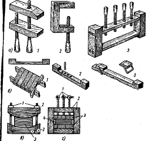 Содержание Введение Инструменты и приспособления Технологическая часть Защитная обработка готовых элементов и конструкций Требования предъявляемые к продукции Требования предъявляемые к материалам Клеи и мастики Техника безопасности Список использованной литературы ВведениеДревесина - один из древнейших материалов, используемых человеком. В современном строительстве древесина занимает важное место и является одним из основных, а в некоторых районах и единственным строительным материалом. По объекту применение и разнообразию использование древесины не может сравниться никакой другой материал. Уникальная совокупность свойств: относительная высокая прочность при малом удельном весе; легкость обработки; высокая химическая стойкость в агрессивных средах; экологическая чистота; широкая распространенность; доступность и восстанавливаемость сырьевой базы (древесина является единственным восстанавливаемым ресурсом); низкая энергоемкость заготовки древесины и изготовление изделий из нее; малая теплопроводность; высокие декоративные и эстетические качества - создает условия для разнообразного использования древесины при строительстве зданий и сооружений различного назначение. Из древесины изготовляют: деревянные несущие конструкции (балки, прогоны, стропила, арки, рамы); ограждающие конструкции (панели, перегородки); встроенную мебель, дверные и оконные блоки. Столяры изготовляют и устанавливают оконные и дверные блоки, встроенную мебель и т.п. В последние годы появилось много новых материалов, разнообразного ручного и электрифицированного инструмента. Стал доступен весь ассортимент используемых в мире материалов, инструментов и технологий. Это не могло, не отразится на традиционных технологиях столярных, плотничных, стекольных и паркетных работ, которое постепенно вытесняются более современными методами, позволяющими уменьшить трудоемкость и повысить качество выполняемых работ. Можно привести многочисленные примеры такого совершенствование технологий. Например, появления более современного и совершенного ручного и электрифицированного инструмента для пиления древесины привело почти к полному отказу от применения традиционной лучковых пил на деревянной рамке и двуручных пил для поперечной распилки. Появление приспособление для заточки стамесок и ножей рубанков позволило сократить трудоемкость, повысить качество и сделать доступным для рабочих любой квалификации заточку инструмента. Использование монтажных пен упростило процесс монтажа оконных и дверных блоков. Появления современных герметиков привело почти к полному отказу от приготовления и нанесения замазки при остеклении и упростило сам процесс остекления. Современные материалы изменили технологию паркетных работ и сделали паркет более доступным. Последние мировые достижение науки и техники в строительной квалификации рабочих строительных специальностей, расширение и углубление их знаний современных технологий, конструкций, изделий, свойств и особенностей используемых материалов, приемов и режимов их обработки, современного и ручного и механизированного инструмента. Инструменты и приспособленияРис.1. Струбцины, сжимы, цулага