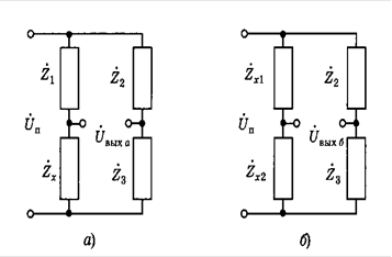 Рис. 3 Нелинейность будет уменьшаться по мере уменьшения Zx по сравнению с ZQ . Однако при этом будет уменьшаться и чувствительность преобразователей. На рис.3, а приведена мостовая схема вторичного преобразователя для недифференциальных датчиков, а на рис.3, б - для дифференциальных. Функции преобразования для этих преобразователей имеют вид.