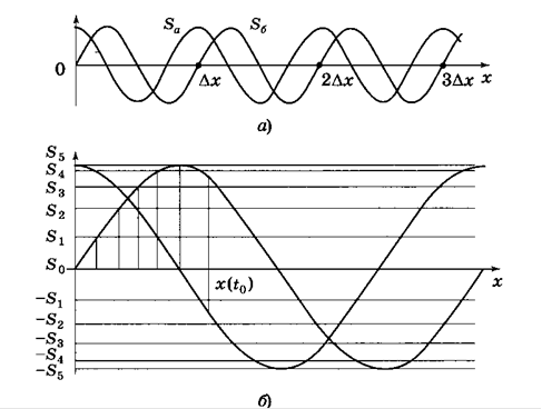 Рис. 7. Непосредственно из рисунка видно, что величину полного перемещения можно найти, определив целое число шагов и часть шага, соответствующую моменту отсчета. Если перемещение происходит в одном направлении, число полушагов можно определить, подсчитывая переходы через нуль любого одного сигнала. Однако при этом нельзя определить даже направление перемещения. Изменение направления движения никак не будет фиксироваться. Поэтому, подсчитывая число переходов через нуль, можно определить полный путь, но не координату. Наличие двух сигналов устраняет эту проблему. При движении в положительном направлении последовательность переходов через нуль с учетом знака производной имеет вид +а, +б, - а, - б, +а,…., что соответствует приращению координаты при каждом переходе на четверть шага. При движении в обратном направлении последовательность переходов будет иной: + а, - б, - а, +б, + а,…., и каждый переход через нуль уменьшает координату на четверть шага. Если в процессе движения происходят реверсы, то каждый переход через нуль изменяет координату на четверть шага, а знак этого изменения определяется направлением перемещения. Признаком реверса является последовательное появление в одном из квадратурных сигналов двух одинаковых переходов через нуль. Таким образом, анализируя и соответствующим образом подсчитывая переходы квадратурных сигналов через нуль, можно определить координату с дискретностью в четверть шага линейки датчика. Меньшую дискретность (имеется в виду малый шаг квантования) можно получить, используя значения сигналов в момент считывания координат. Алгоритм интерполяции можно пояснить следующим образом. Пусть периодические сигналы Sa ( t) и S6 ( t), сдвинутые относительно друг друга на четверть шага, имеют стабильную одинаковую форму, будучи четными функциями относительно осей, проходящих через экстремумы, и нечетными относительно осей, проходящих через нулевые значения сигналов. Отличие этих функций от моделей в виде синусоиды или кусочно-линейной функции не имеет принципиального значения, важна стабильность их формы. Разобьем четверть шага шкалы на п равных интервалов и обозначим через S - верхние границы этих интервалов (рис.2.7, б). Тогда, как видно из рисунка, абсолютное значение поправки σх при снятии отсчета перемещения в момент времени t0 можно рассчитать по формуле