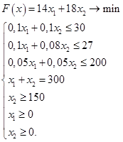 Себестоимость одного килограмма ржаной муки составляет 14 рублей, а пшеничной - 18 рублей. Требуется найти оптимальный план производства продукции, позволяющий цеху выполнить условия контракта с наименьшими затратами. Решение. Пусть x1 - объем производства ржаной муки, x2 - объем производства пшеничной муки. Тогда задача может быть описана в виде следующей модели линейного программирования:
